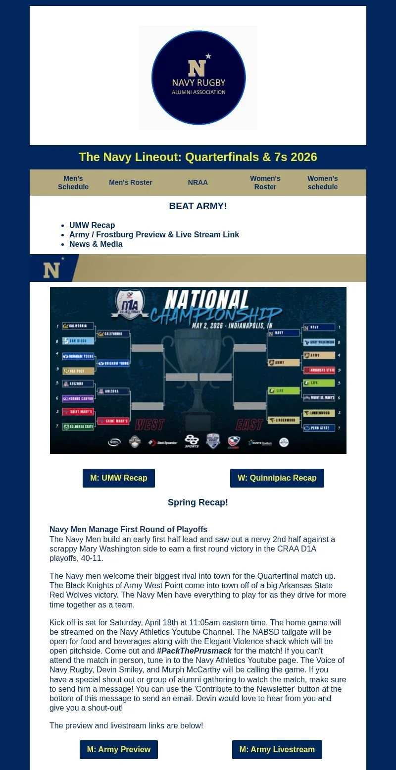 Navy Rugby Lineout Newsletters Navy Lineout Newsletter (29 Aug 2025): 2025-2026 Season Kickoff Navy Lineout Newsletter (29 Aug 2025): 2025-2026 Season Kickoff Navy Lineout Newsletter (6 Sep 2025): 2025-2026 Week 1-2 Navy Lineout Newsletter (6 Sep 2025): 2025-2026 Week 1-2 Navy Lineout Newsletter (12 Sep 2025): 2025-2026 Week 2-3 Navy Lineout Newsletter (12 Sep 2025): 2025-2026 Week 2-3 Navy Lineout Newsletter (20 Sep 2025) : 2025-2026 Week 3-4 Navy Lineout Newsletter (20 Sep 2025) : 2025-2026 Week 3-4 Navy Lineout Newsletter (26 Sep 2025): 2025-2026 Week 4-5 Navy Lineout Newsletter (26 Sep 2025): 2025-2026 Week 4-5 Navy Lineout Newsletter (4 Oct 2025): 2025-2026 Week 5-6 Navy Lineout Newsletter (4 Oct 2025): 2025-2026 Week 5-6 Navy Lineout Newsletter (11 Oct 2025): 2025-2026 Week 6-7 Navy Lineout Newsletter (11 Oct 2025): 2025-2026 Week 6-7 Navy Lineout Newsletter (17 Oct 2025):2025-2026 Week 7-8 Navy Lineout Newsletter (17 Oct 2025):2025-2026 Week 7-8 Navy Lineout Newsletter (24 Oct 2025): 2025-2026 Week 8-9 Navy Lineout Newsletter (24 Oct 2025): 2025-2026 Week 8-9 Navy Lineout Newsletter (31 Oct2025): 2025-2026 Week 9-10 Navy Lineout Newsletter (31 Oct2025): 2025-2026 Week 9-10 Navy Lineout Newsletter (15 Nov 2025): 2025-2026 Week 10-11 Navy Lineout Newsletter (15 Nov 2025): 2025-2026 Week 10-11 Navy Lineout Newsletter (6 Mar 2026): 2025-2026 Week 14 Navy Lineout Newsletter (6 Mar 2026): 2025-2026 Week 14 Navy Lineout Newsletter (10 Apr 2026): 2025-2026 Week 19 Navy Lineout Newsletter (10 Apr 2026): 2025-2026 Week 19 Navy Lineout Newsletter (17 Apr 2026) 2025-2026 Week 20 Navy Lineout Newsletter (17 Apr 2026) 2025-2026 Week 20